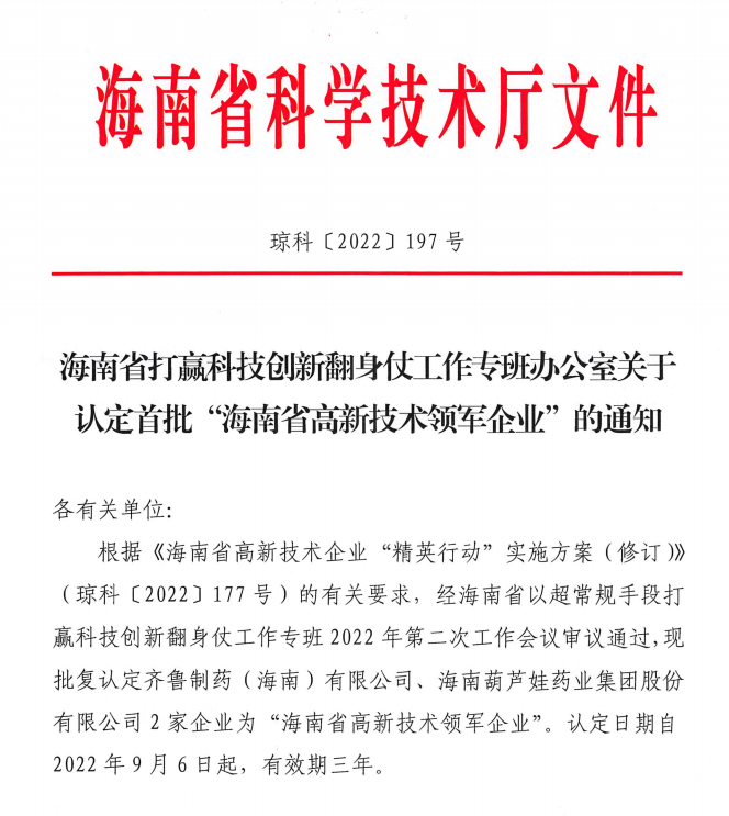 近日,海南省科学技术厅发布的《海南省打赢科技创新翻身仗工作专班办公室关于认定首批“海南省高新技术领军企业”的通知》中显示,批复认定海南尊龙凯时-人生就是搏药业集团股份有限公司等2家企业为“海南省高新技术领军企业”。认定日期自2022年9月6日起,有效期三年。